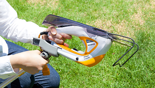 ハンディタイプのバリカンは、ワンタッチでポール(別販売品)を取り付けられます。